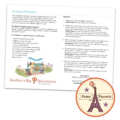 Enjoy the tasty treat, Odilia, the duck, ordered in the KeeKee’s Big Adventures in Paris, France picture book – when the friends had crêpes in Paris’ Tuileries Garden, a Croque-Monsieur!
